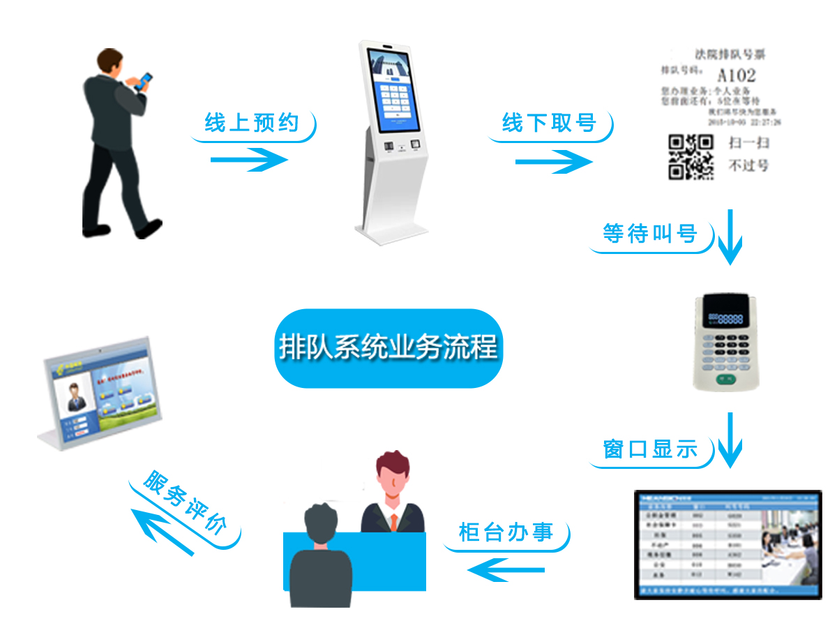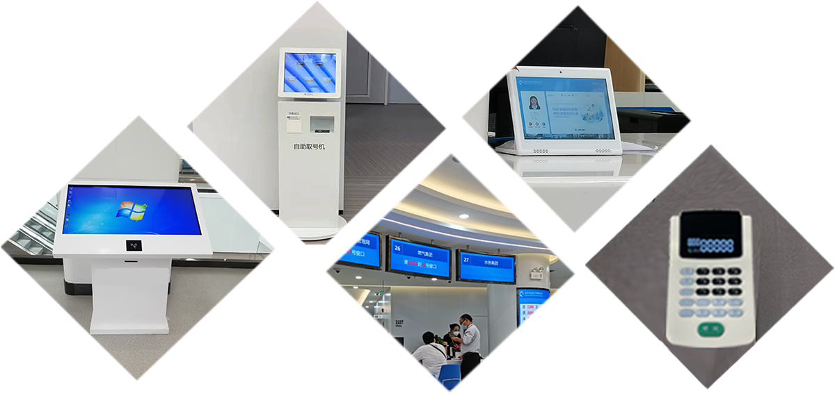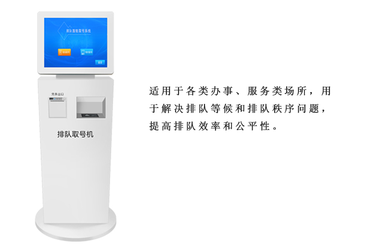 排隊叫號系統匹配的取號機,常規尺寸有17、18.5、21.5、32、43、55寸,外設包括小票打印機、二維碼掃描模塊、身份證讀卡器模塊。