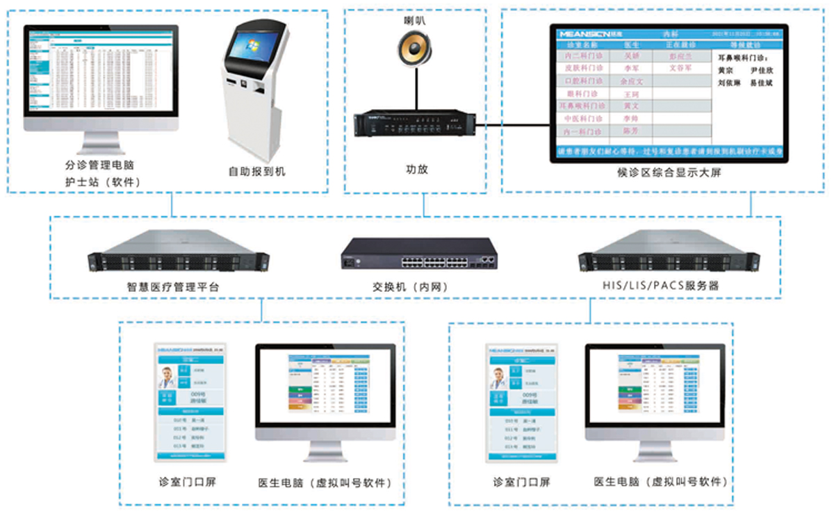 智慧醫療排隊叫號系統,包括門診排隊叫號系統、藥房排隊叫號系統、醫技排隊叫號系統、體檢中心排隊叫號系統、預防接種中心排隊叫號系統等產品,在結合醫院現狀的情況下,結合醫院實際需求定制開發的一整套醫院排隊解決方案,主要用途是幫助醫院提高服務效率,減少患者排隊等候時間,在與HIS/PACS/LIS等醫院管理系統對接的情況下,做到精準的患者分流。