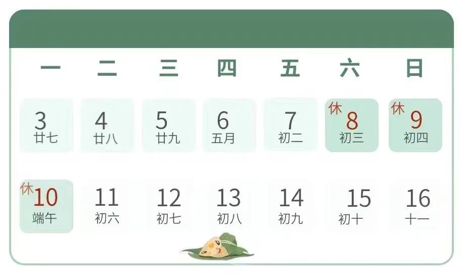 放假時間:2024年6月8日(周六)至2024年6月10日(周一)放假,共3天;